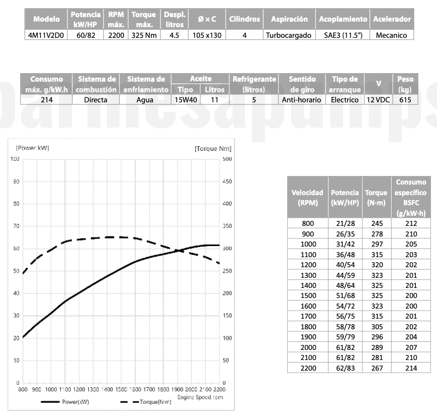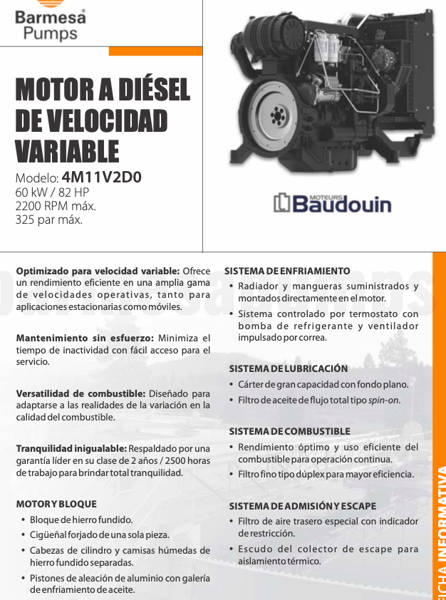 - Motor: se ensambla a motor Baudouin 4M11V2D0 de combustión interna a diésel, de 4 tiempos, turbocargado, arranque electrico 12 vdc, enfriado por agua.