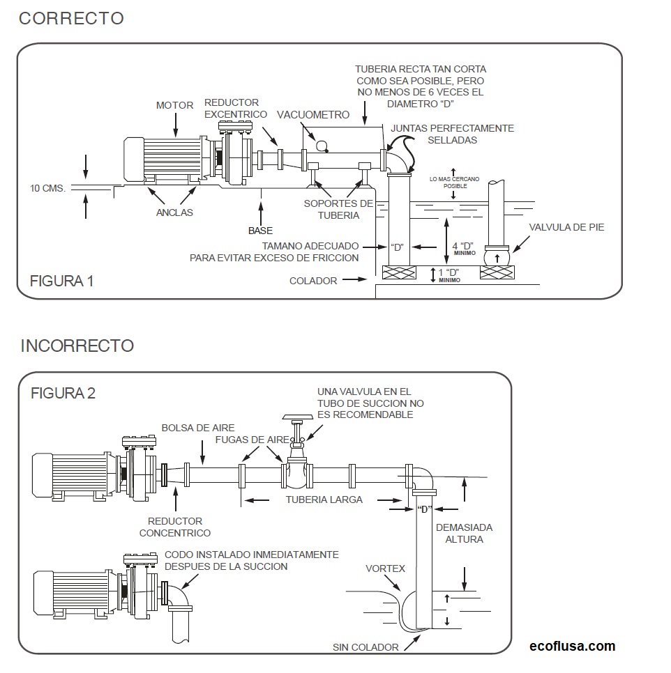 La tubería de succión deberá de tener una inclinación de 1cm por cada metro de succión y nunca exceder los 5m de succión considerando fricción.