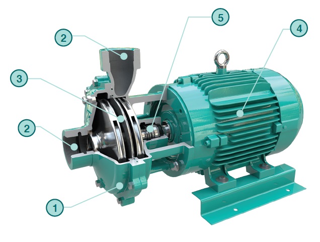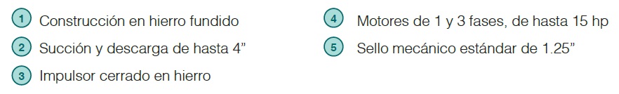 Motobomba centrifuga horizontal de mediana presión, cuyo diseño resiste largas horas laborales garantizando alta eficiencia en su ejercicio. En el catálogo poseemos gran variedad de tamaños y cada uno de los equipos fueron construidos en hierro fundido; con un impulsor tipo cerrado balanceado; sello mecánico estándar en carbón, cerámica, buna y acero inoxidable. El sello mecánico y el impulsor están directamente acoplados al motor eléctrico horizontal. Este acoplamiento, avala, como se mencionó con anterioridad, una eficiencia premium de servicio continuo S1. Asimismo, otra caracteriza de estos equipos es que se encuentran totalmente cerrados con ventilación exterior.