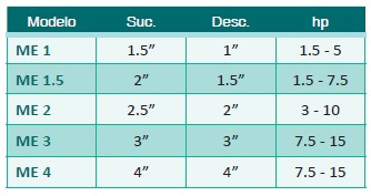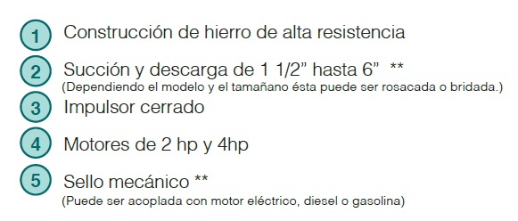 Motobomba centrifuga horizontal tipo casero con amplia variedad de tamaños. El diseño de los equipos garantiza una alta eficiencia y gran resistencia, puesto que fueron construidos en hierro fundido con sello mecánico estándar en carbón, cerámica, buna y acero inoxidable. De igual manera, los impulsores son de tipo cerrado balanceado, las cuales fueron acoplados directamente a los motores eléctricos. Es necesario agregar, que este acoplamiento estuvo bajo observación para asegurar la erradicación de goteras.