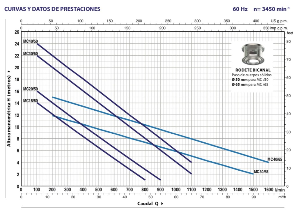 - La serie MC está equipada con un impulsor de dos canales, ideal para grandes caudales de aguas residuales.
