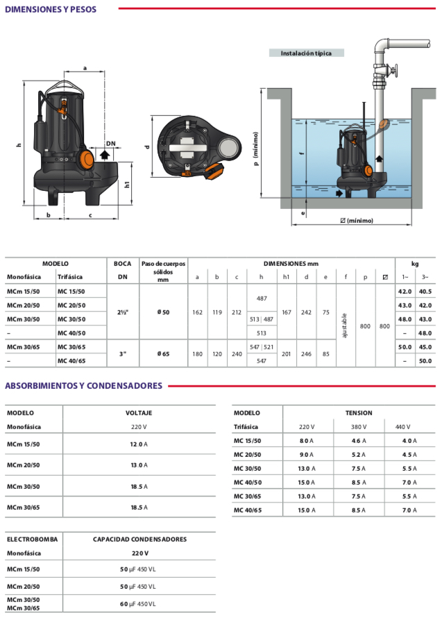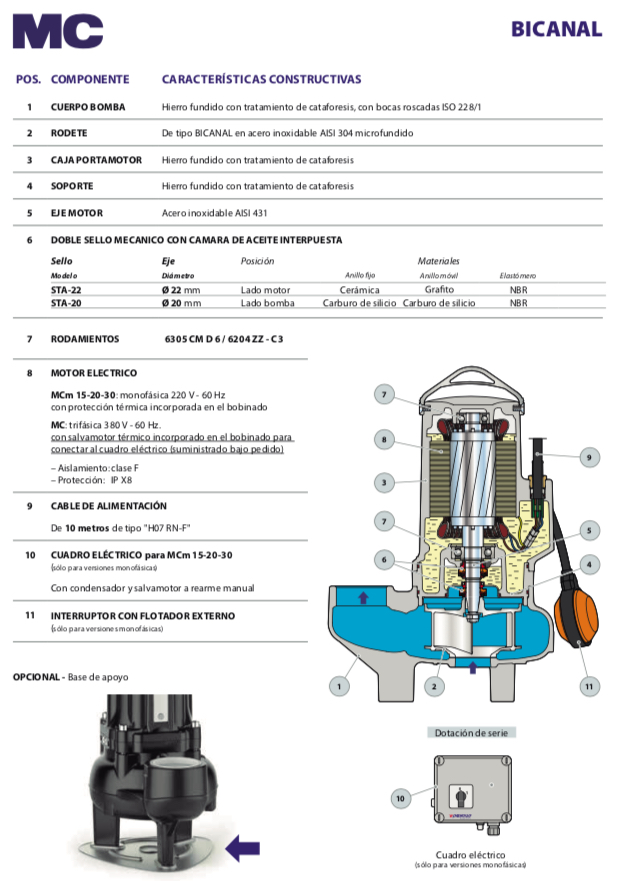 Las bombas sumergibles MC, construidas en hierro fundido con espesor de material consistente, se caracterizan por una gran robustez, alta resistencia a la abrasión y durabilidad. Asimismo, están equipadas con rodete tipo BICANAL. De modo que, son adecuadas para el drenaje de aguas con sólidos en suspensión con fibra corta, para el manejo de aguas de descarga y cloacales, aguas mixtas con fango, aguas freáticas y de superficie. Los equipos MC fueron diseñados para dirigirse a las áreas de condominios, edificios, industria, aparcamientos subterráneos, zonas de lavado, entre otros.