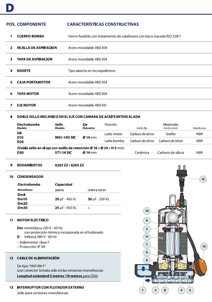 - Electrobombas D8-10-20 con cable de alimentación de 10 m.