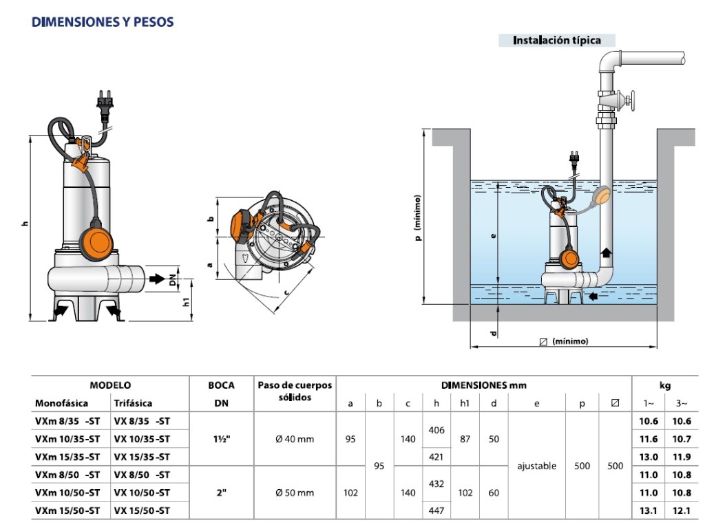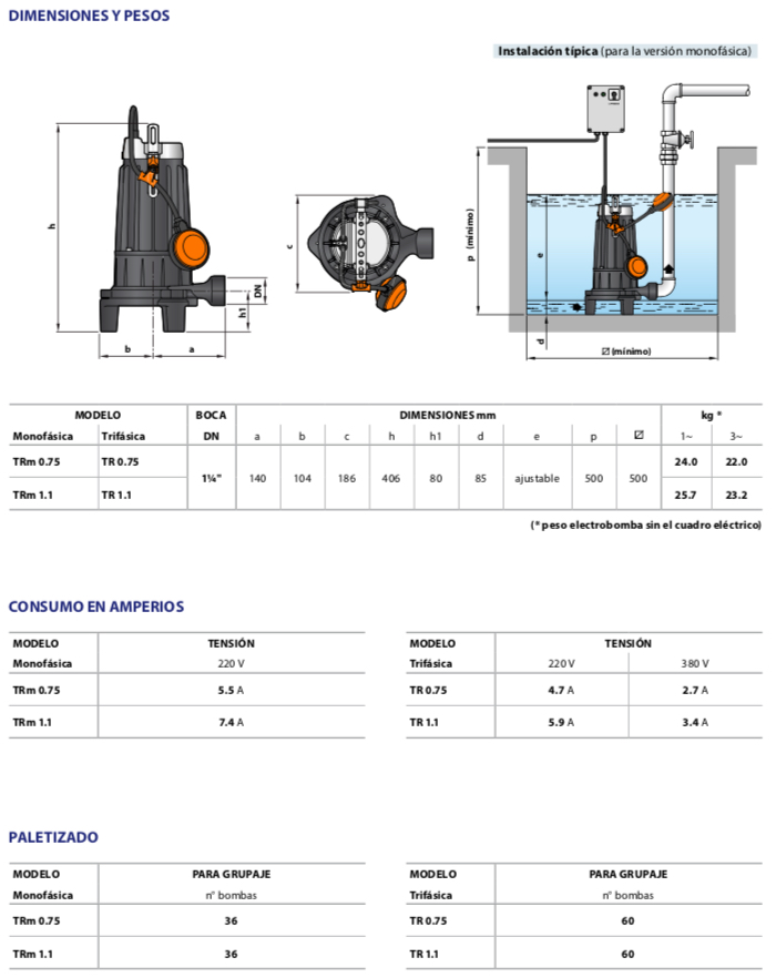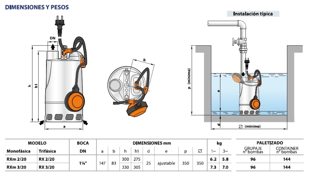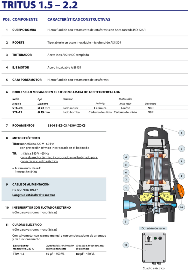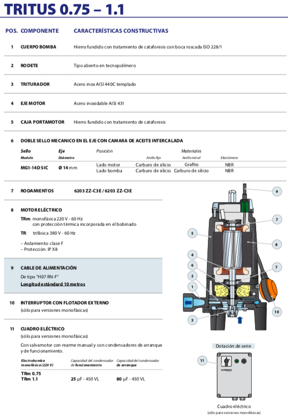 - Disponible la versión monofásica sin interruptor y flotador externo.
