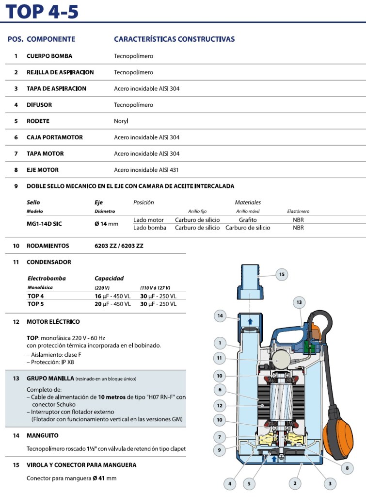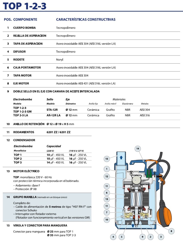 La serie TOP es adecuada para el drenaje de aguas claras sin partículas abrasivas. Las soluciones constructivas empleadas garantizan la facilidad de uso y la seguridad de funcionamiento gracias a la refrigeración total del motor y al doble sello en el eje. Son aconsejables en situaciones de emergencia para el vaciado de pequeños locales inundados (cantinas, garajes etc), vaciado de aguas residuales provenientes de lavavajillas y lavadoras, así como para el vaciado de pozos de recojida.