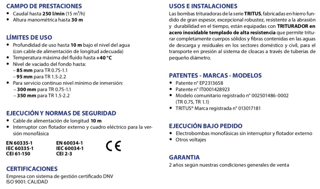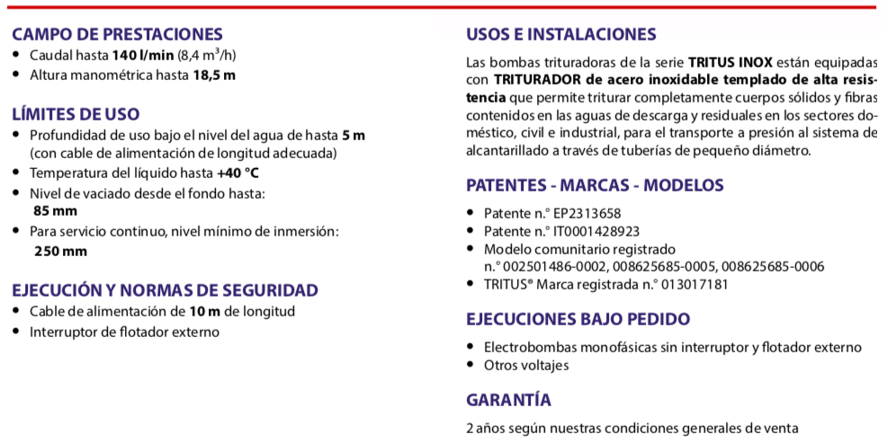 TRITUS INOX es ideal en viviendas unifamiliares o bifamiliares cuando no se dispone de sistemas de alcantarillado por gravedad y existen grandes desniveles o pérdidas de carga; además, sus características constructivas la hacen fácil de instalar y simple de manejar en caso de mantenimiento.