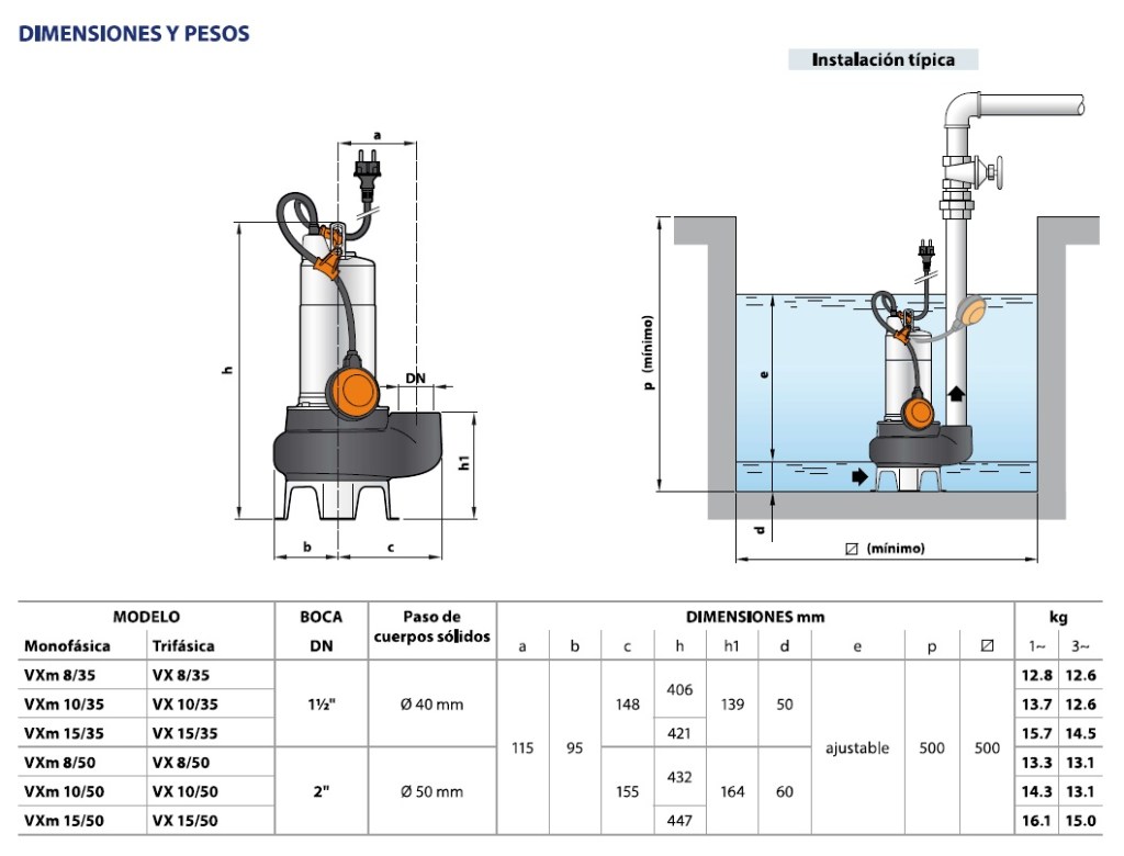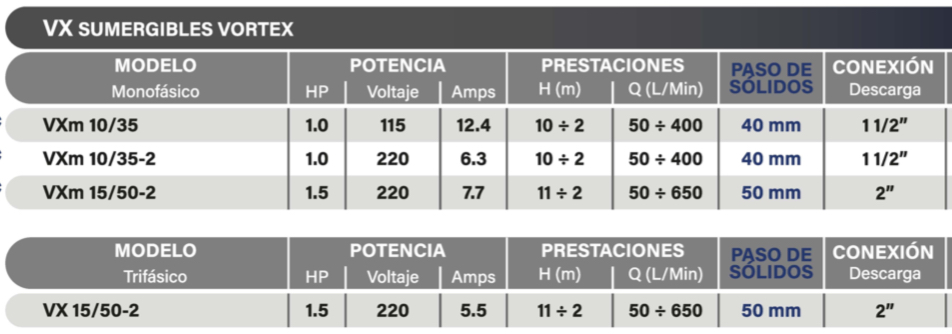 Las electrobombas VX son aconsejadas para el uso doméstico, civil e industrial, especialmente en aquellos casos en donde se presenten cuerpos sólidos en una suspensión de Ø 50 mm en la densidad del agua. Por ejemplo, aguas subterráneas, aguas de superficie, agua inundadas, entre otros. Estas bombas se caracterizan por su fiabilidad en las instalaciones fijas con funcionamiento automático.