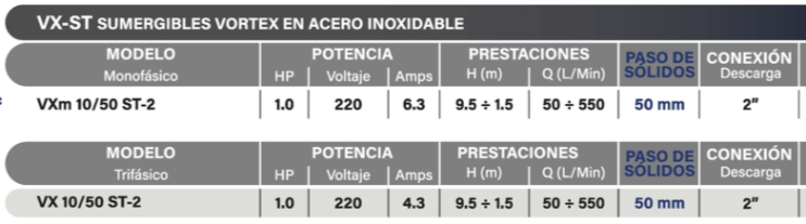 Las electrobombas sumergibles en acero inoxidable VX-ST son aconsejables para el drenaje de aguas cargadas dentro del sector doméstico, civil e industrial. No obstante, este drenaje es posible siempre y cuando las aguas presenten cuerpos sólidos en suspensión. Por ejemplo, aguas mixtas con lodo, aguas subterráneas, aguas de superficie, entre otros. De igual forma, los equipos VX-ST pueden ejercer vaciados de ambientes inundados como: cantinas, garajes subterráneos, áreas de auto-lavado, para el vaciado de pozos de aguas negras y para el vaciado de purines. Estas bombas se caracterizan por su fiabilidad en las instalaciones fijas con funcionamiento automático.