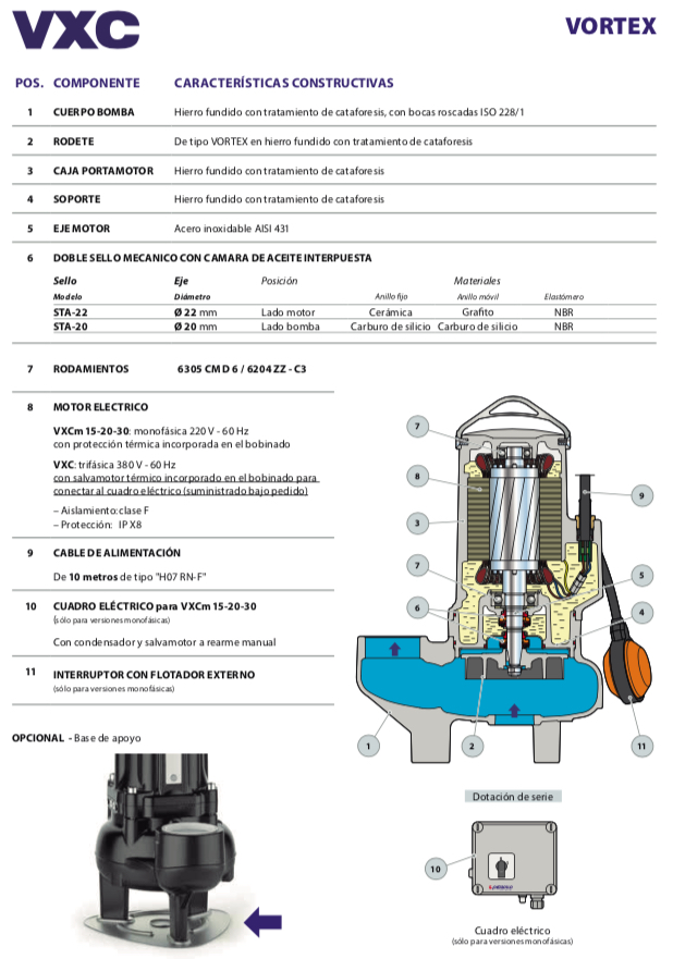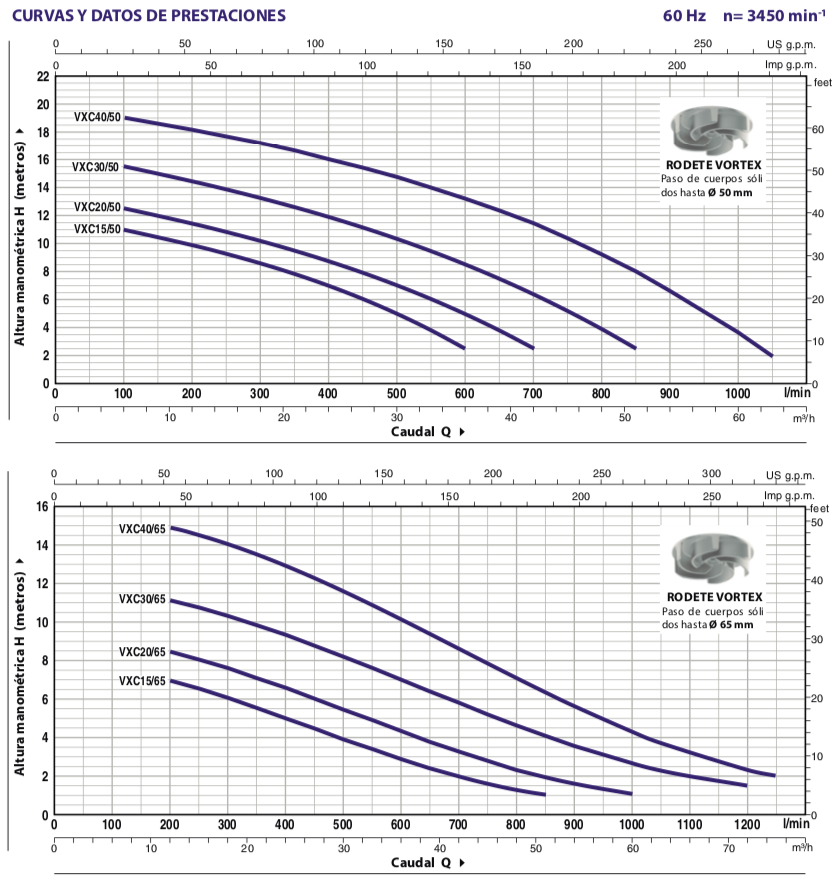 - La serie VXC está equipada con un impulsor VORTEX especialmente recomendado por su operación confiable y el bajo riesgo de obstrucción.