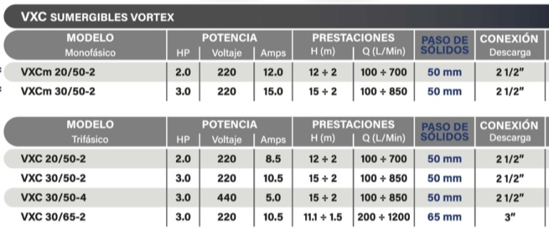 Las bombas de la serie VXC están fabricadas en hierro fundido de gran espesor, con una robustez excepcional, resistente a la abrasión y gran durabilidad. Asimismo, están equipadas con un impulsor de tipo VORTEX; por lo tanto, estos equipos son aptos para el drenaje de aguas cargadas con desechos, aguas mixtas con lodo y fangos pútridos. De igual manera, las bombas de la serie VXC pueden ser utilizadas para la instalación de saneamientos, túneles, excavaciones, canales, estacionamientos subterráneos, etc.