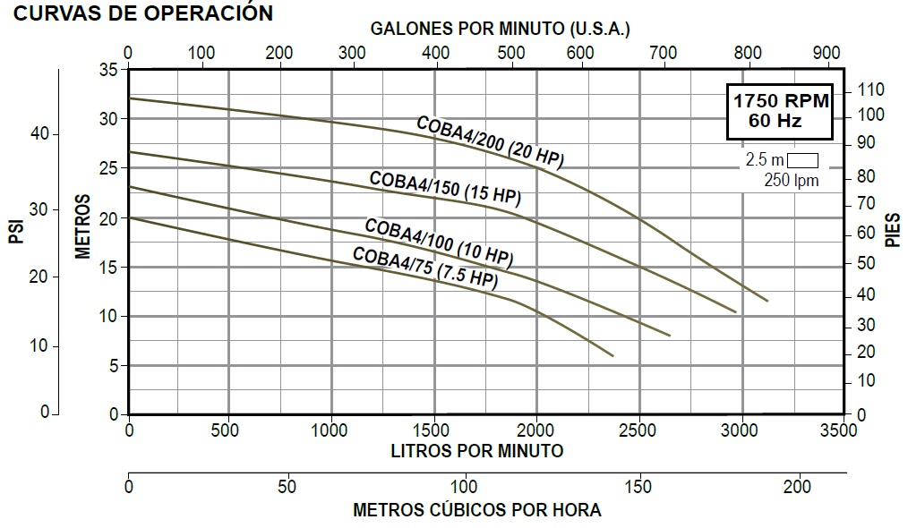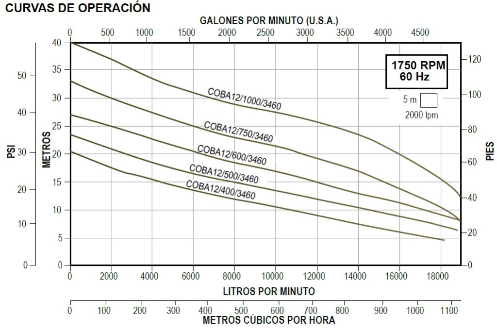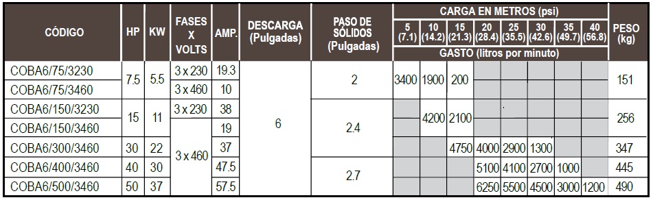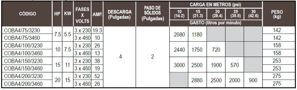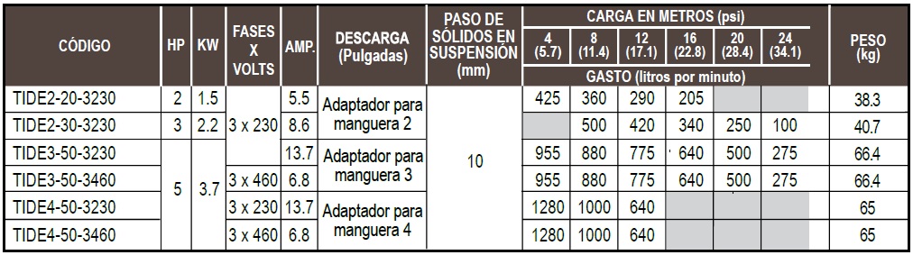 - Cuatro polos (1,750 rpm) con aislamiento clase F y protección IP68 que soporta una máxima de 35º C para bombear.