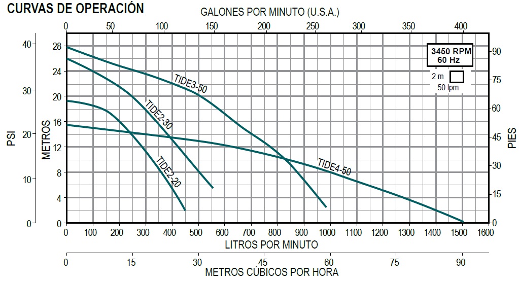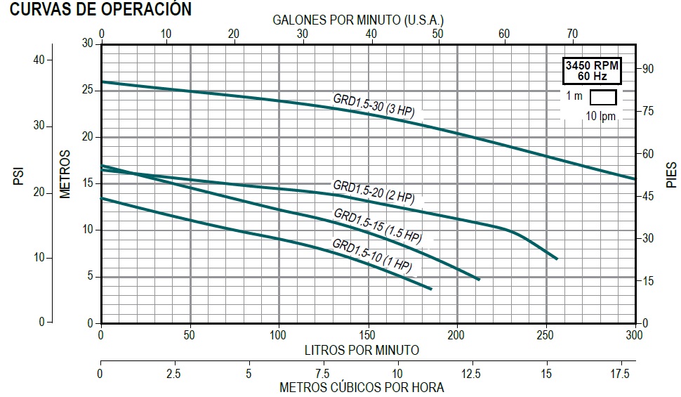 - Motor asíncrono, dos polos (3450 RPM), aislamiento clase F con protección IP68. Incluye 7.5 m de cable sumergible tomacorriente,