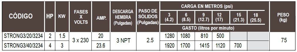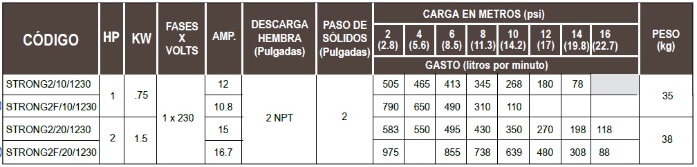 - STRONG 4: Incluye 10 m de cable sumergible tomacorriente. Asimismo, cuenta con dos sensores para protección contra humedad en el motor y en el sello mecánico.
