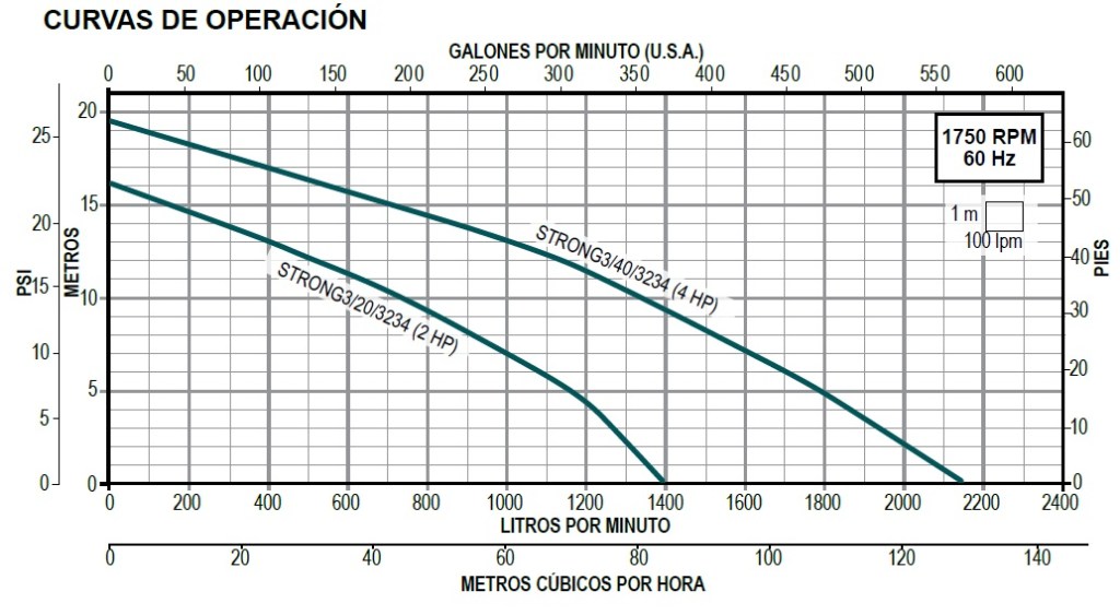 STRONG 3 y STRONG 4: Cuatro polos (1750 rpm) con aislamiento clase H para mayores temperaturas –– Máxima temperatura del agua a bombear: 35°C ––.