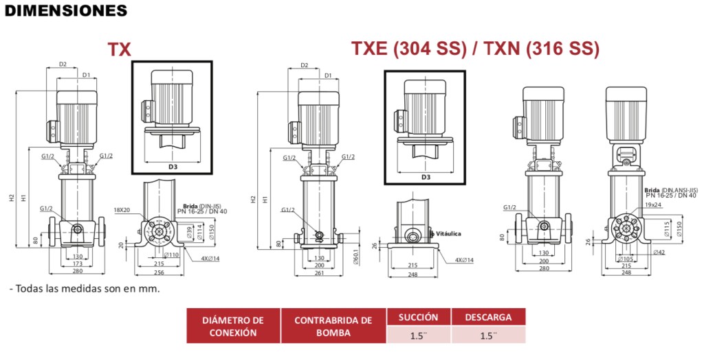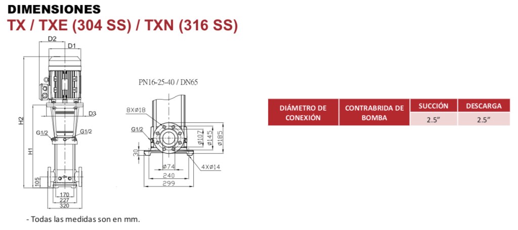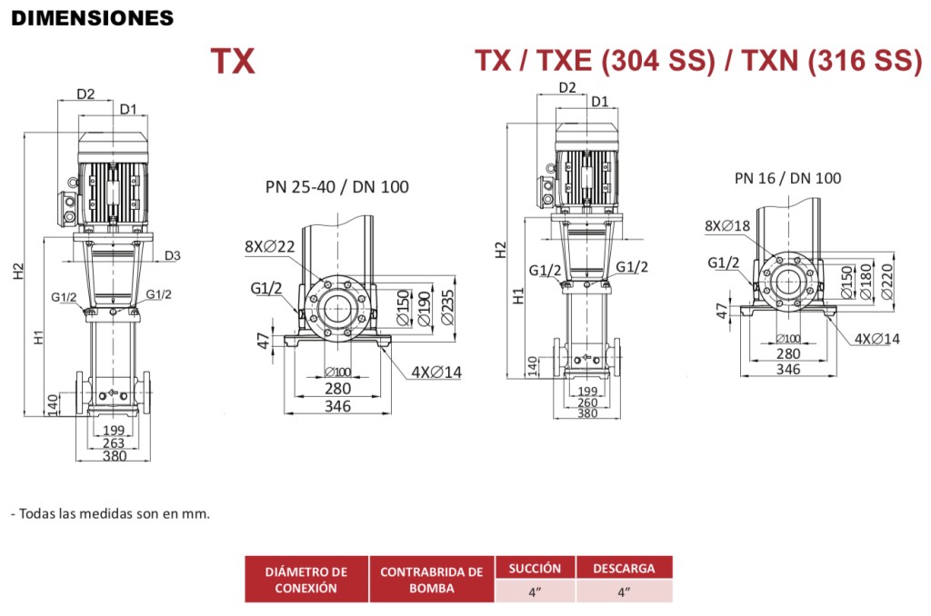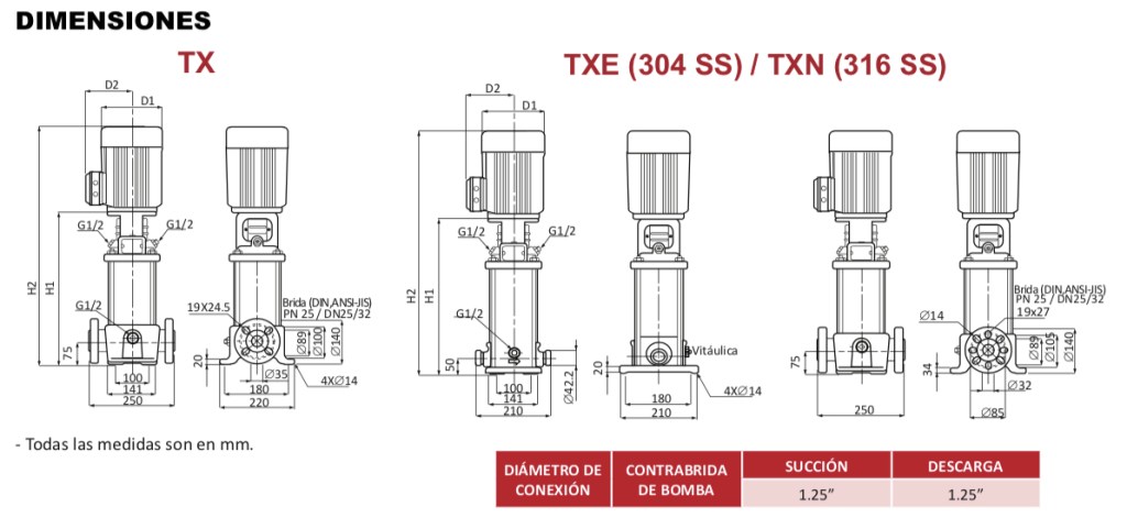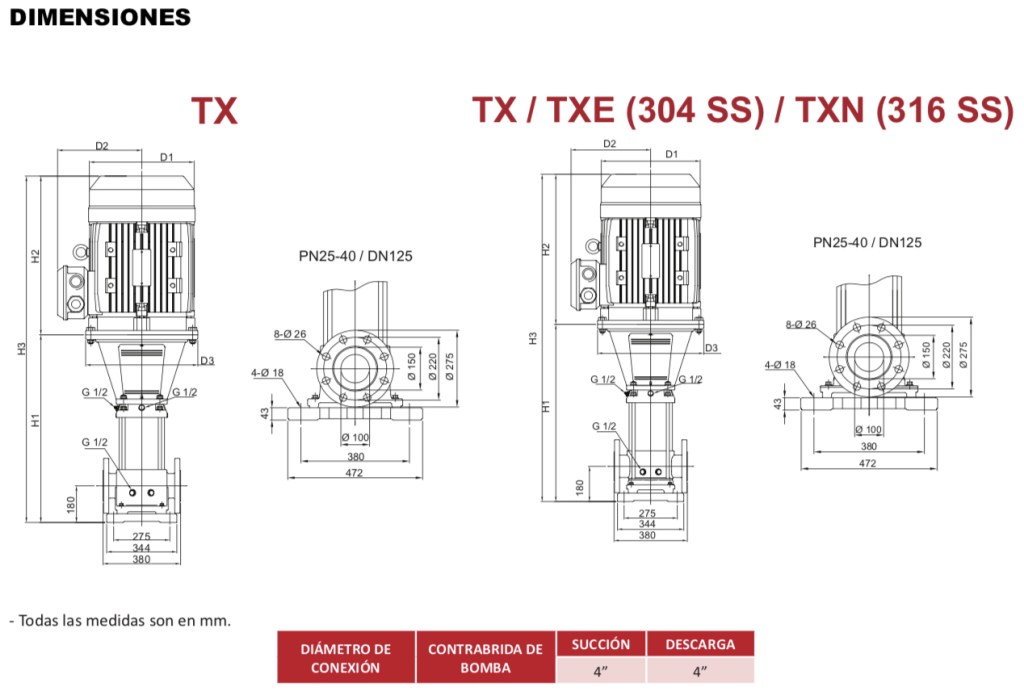 - -TX: Acero inoxidable AISI 304 / Hierro vaciado. -TXE: Acero inoxidable AISI 304.