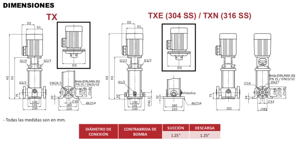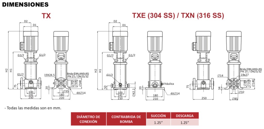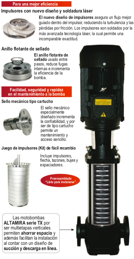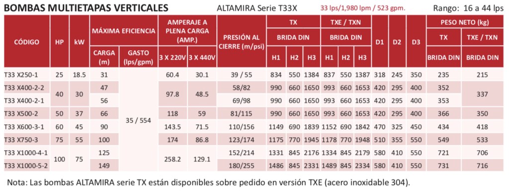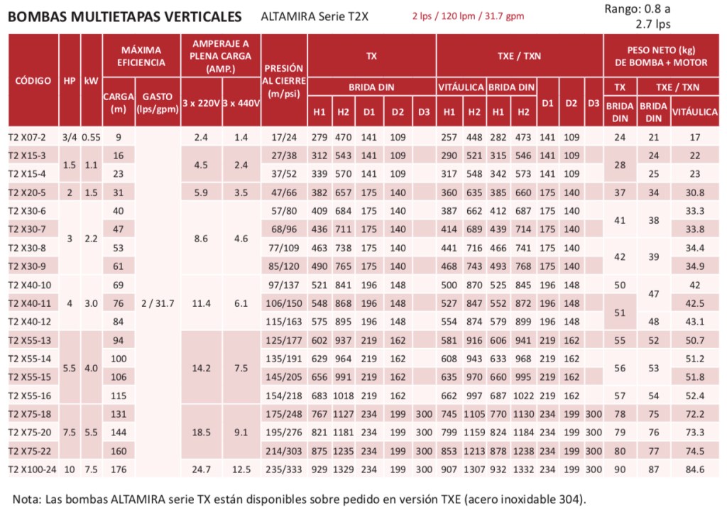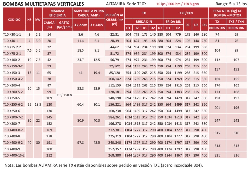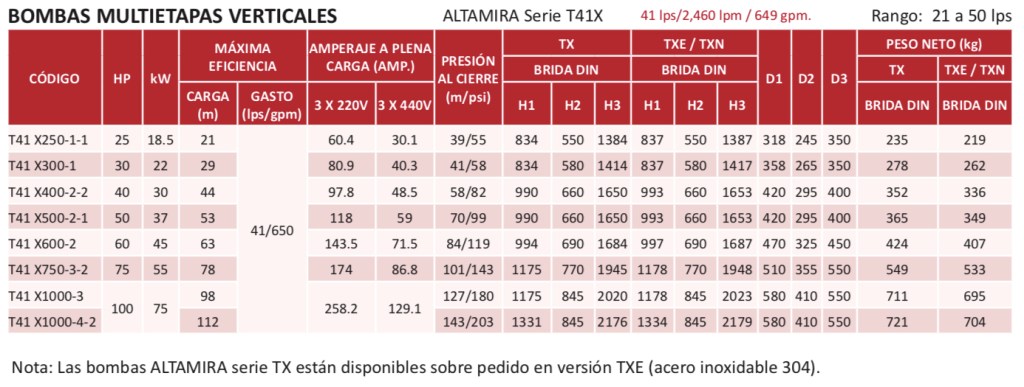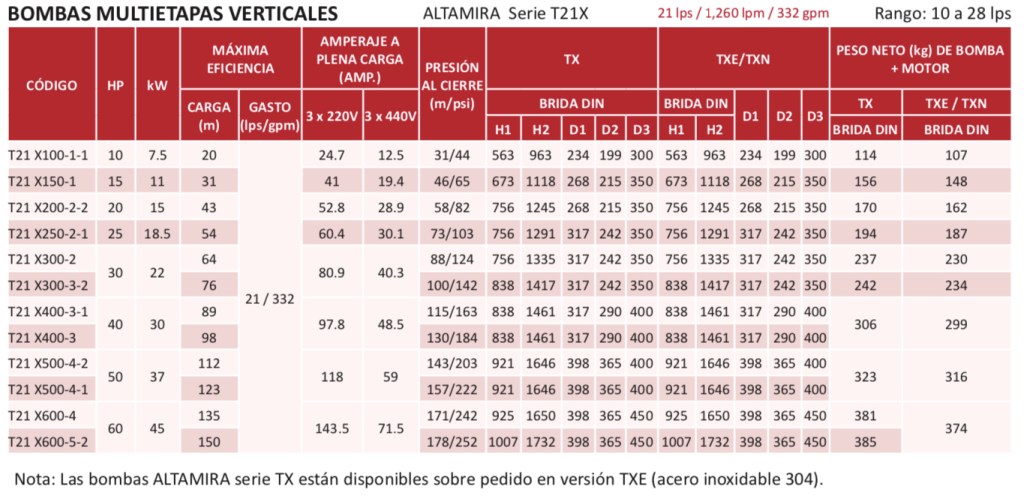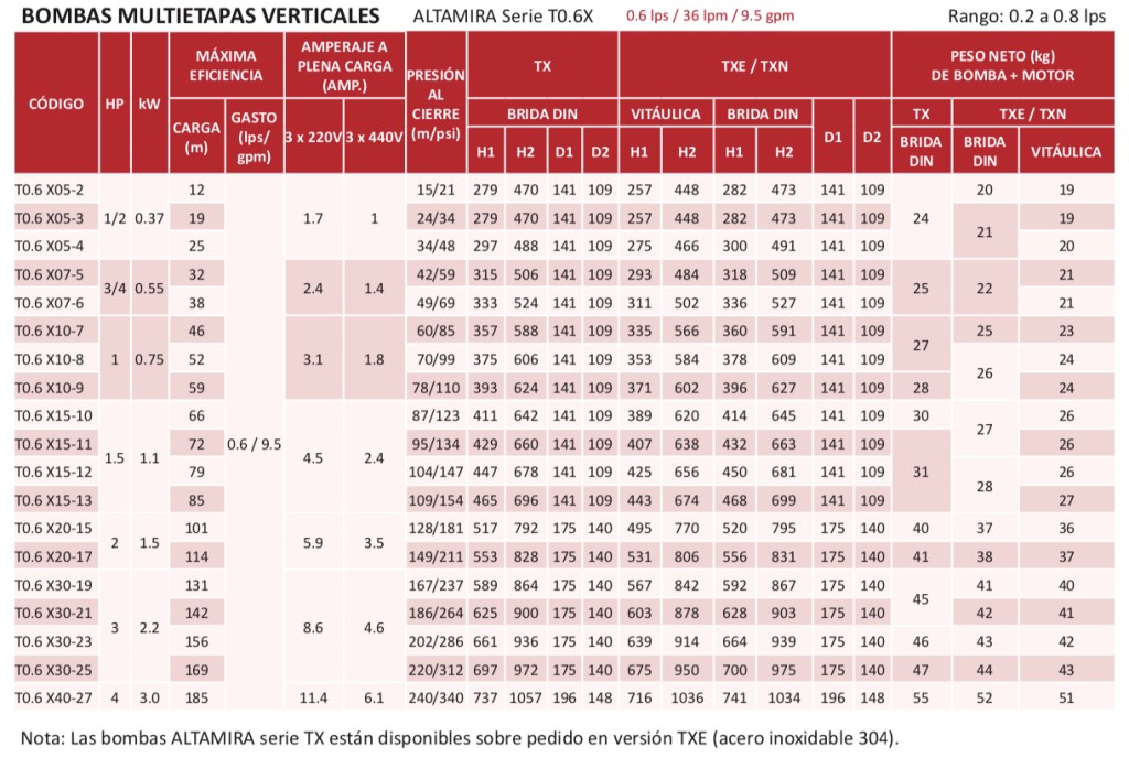 - Las bombas verticales multietapas ALTAMIRA serie TXE están disponibles en 12 rangos de flujo y más de 150 de rangos de presión, asegurando al consumidor que encontrará la bomba adecuada para su necesidad.