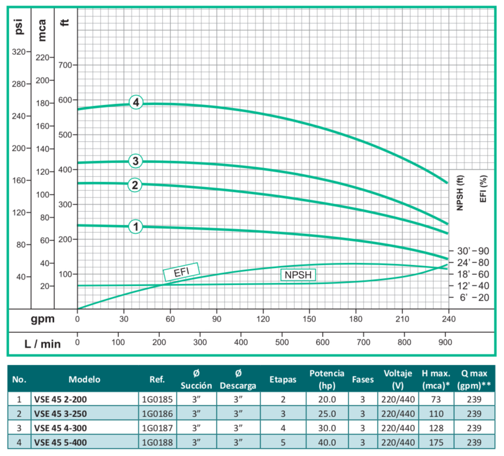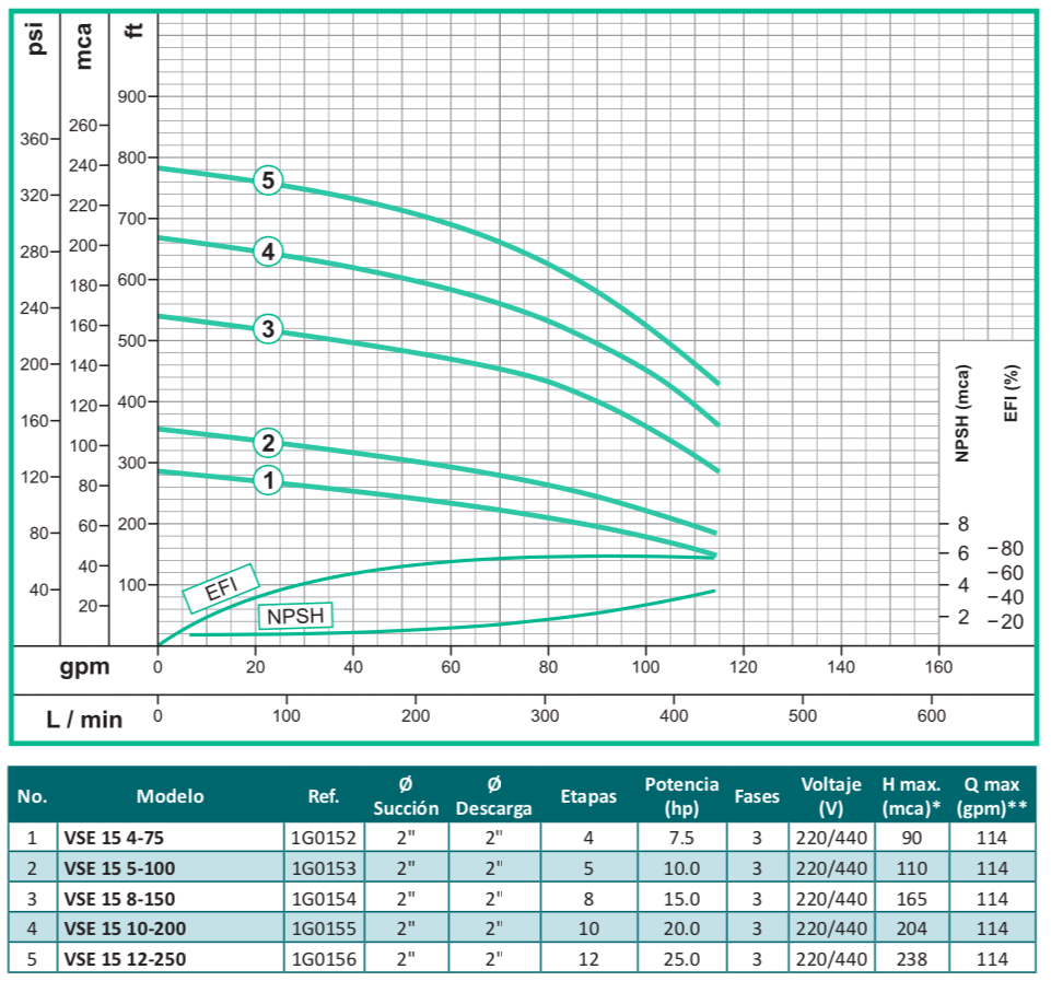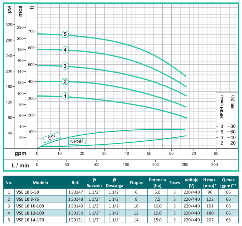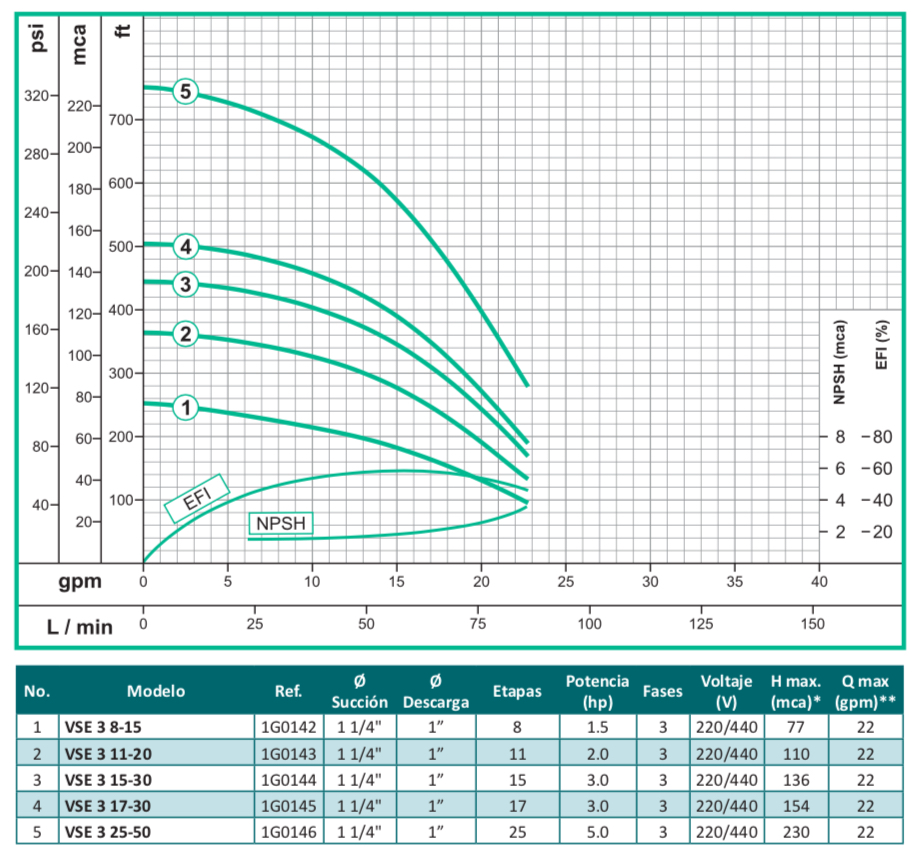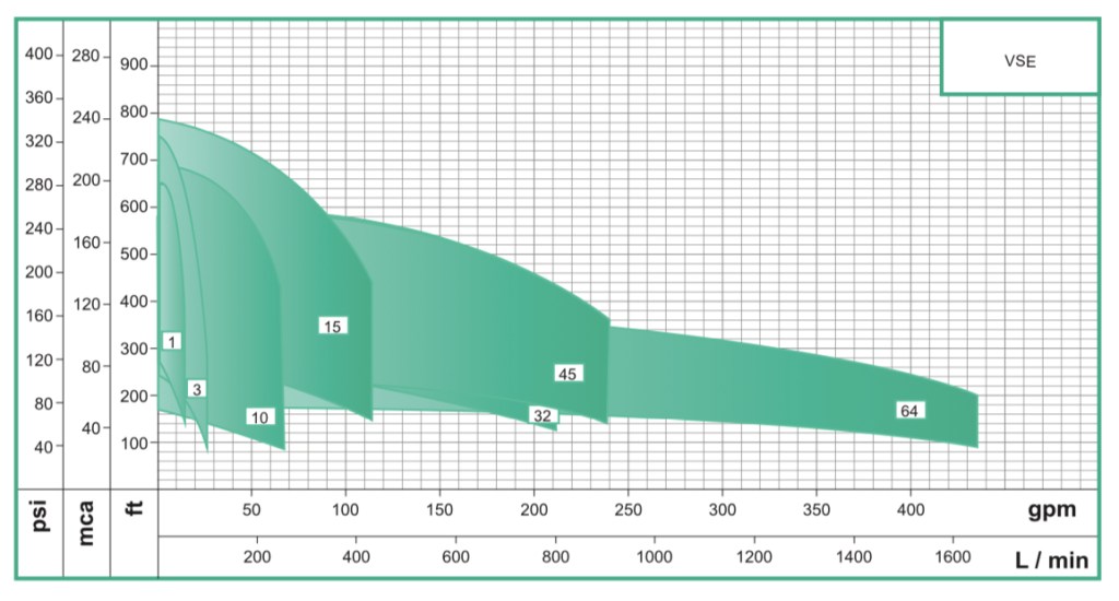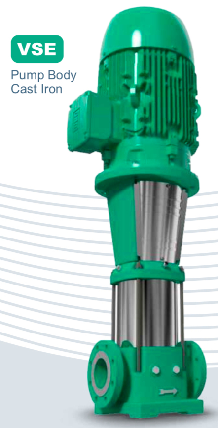 La bomba centrifuga vertical en línea multietapas serie VSE, esta especialmente diseñadas para alcanzar altas presiones, orientado al mercado industrial y comercial, fabricado en sus partes internas en acero inoxidable 304 y puertos en hierro con normas de conexión ANSI, tiene una capacidad de alcanzar cargas hasta 240 mca con un flujo de hasta 436 gpm y una temperatura máxima de 70ºC, disponible en 7 tamaños diferentes y acopladas a motores eléctricos con potencia de hasta 40 hp trifásicos tccv Eficiencia Premium protección IP55 certificación IE3.