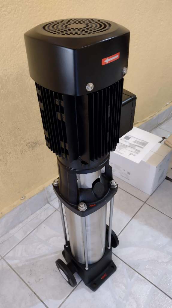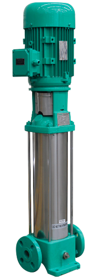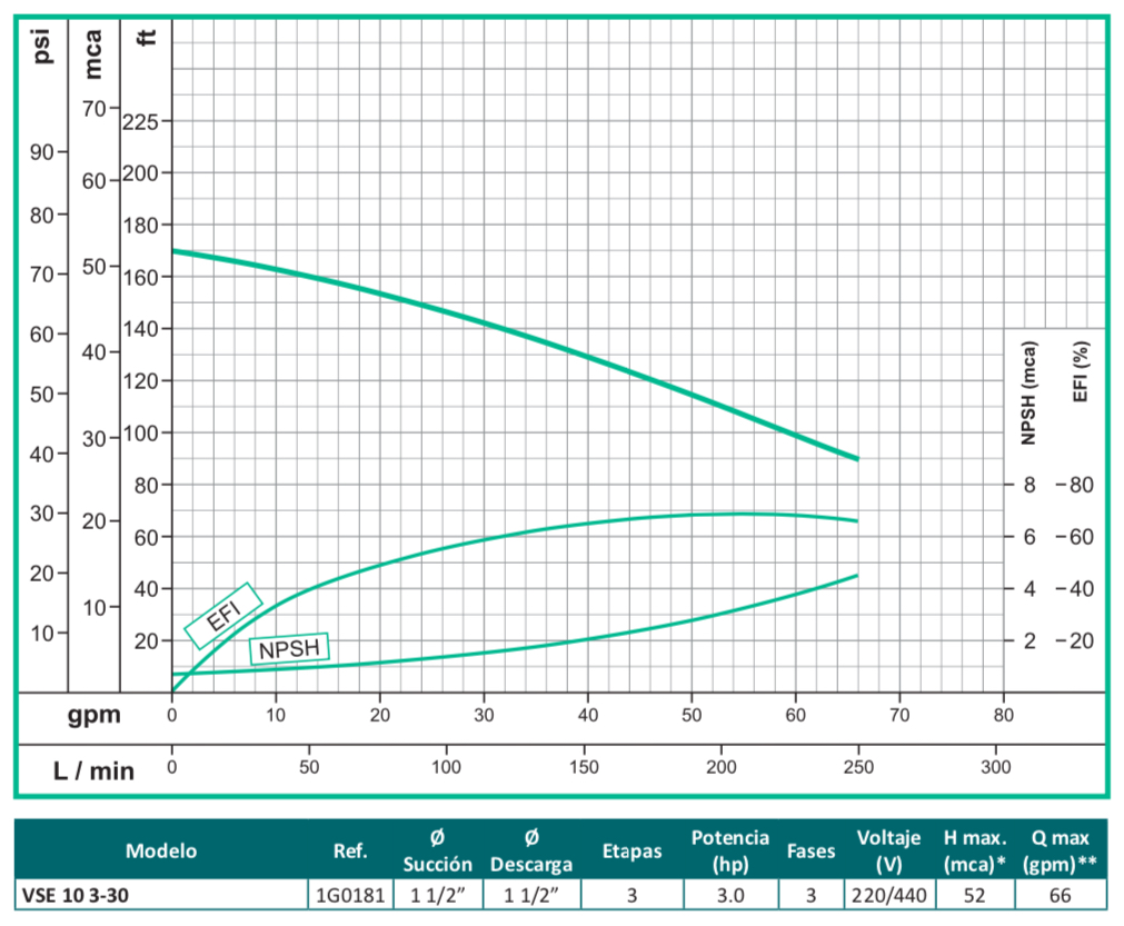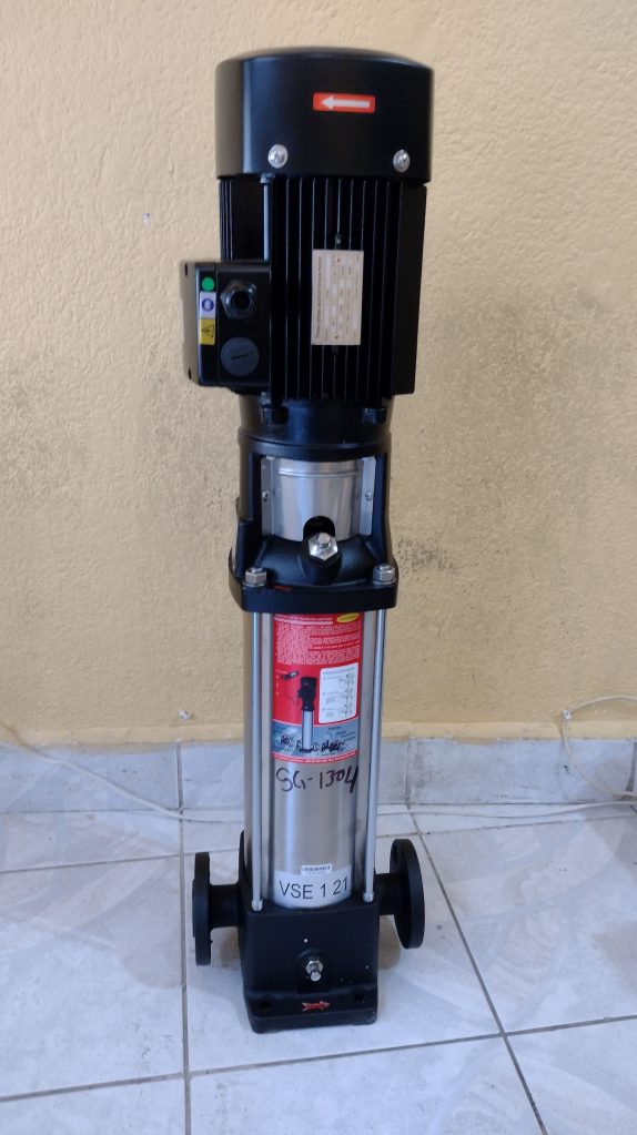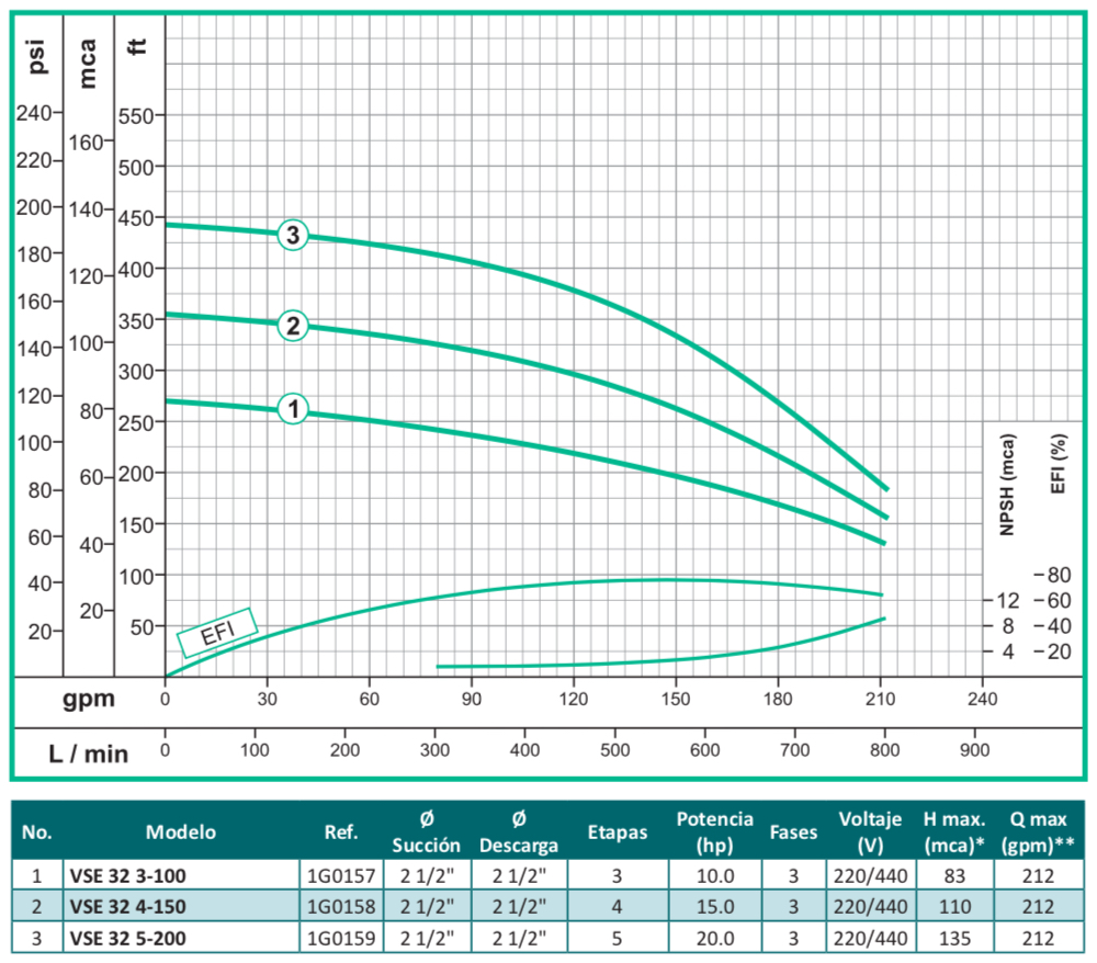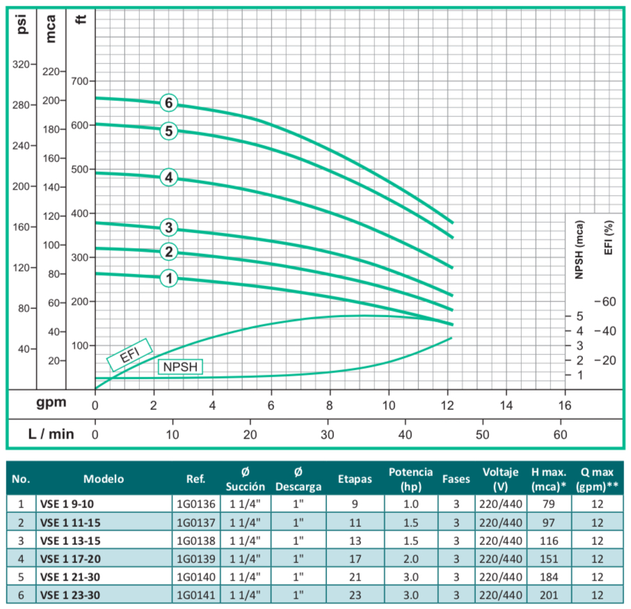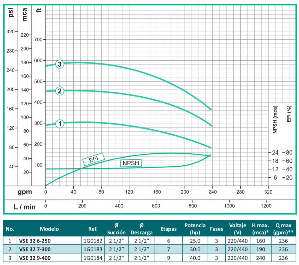 La bomba centrifuga vertical en línea multietapas serie VSE, esta especialmente diseñadas para alcanzar altas presiones, orientado al mercado industrial y comercial, fabricado en sus partes internas en acero inoxidable 304 y puertos en hierro con normas de conexión ANSI, tiene una capacidad de alcanzar cargas hasta 240 mca con un flujo de hasta 436 gpm y una temperatura máxima de 70ºC, disponible en 7 tamaños diferentes y acopladas a motores eléctricos con potencia de hasta 40 hp trifásicos tccv Eficiencia Premium protección IP55 certificación IE3.