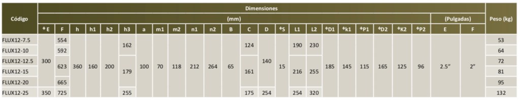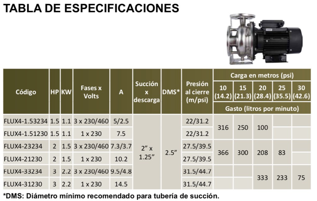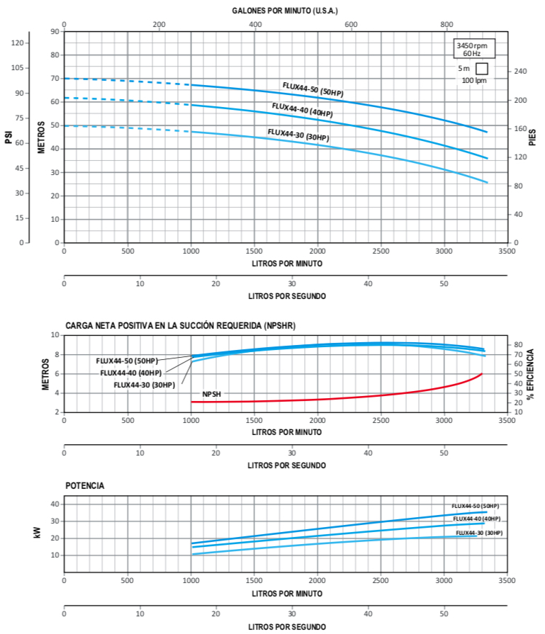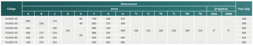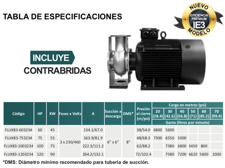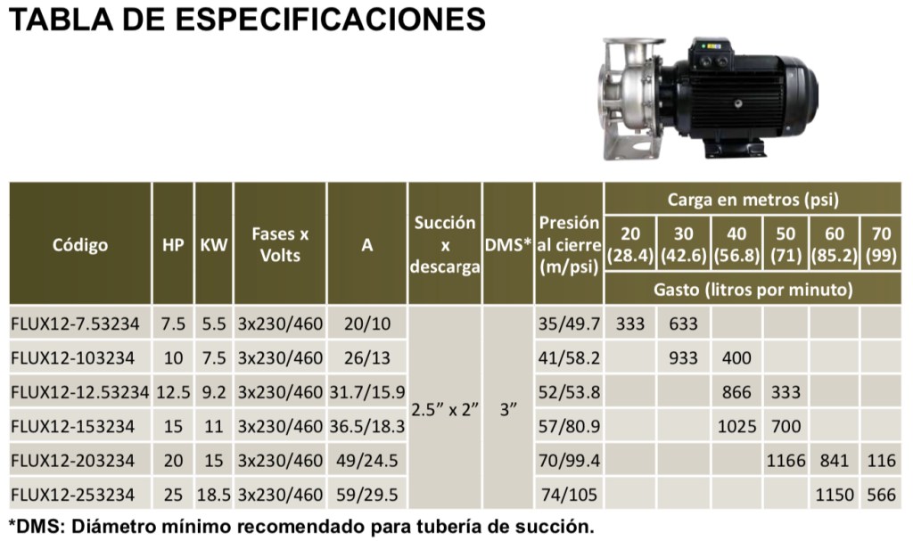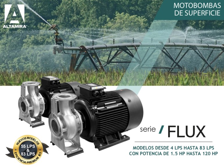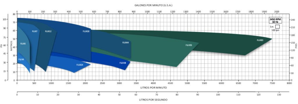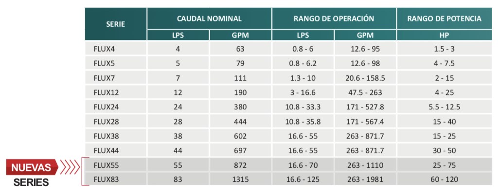 Las motobombas horizontales monoetapa serie FLUX están disponibles en 10 rangos de flujo, más de 40 rangos de presión y con potencias desde 1.5 hasta 120 Hp. Por ello, se le asegura al usuario que tendrá la capacidad de encontrar el equipo que más se adecué a su necesidad.