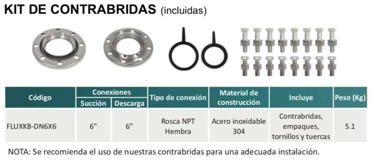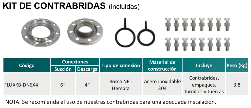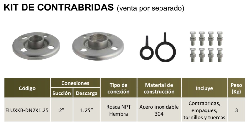- Contrabridas tipo DIN estándar en acero inoxidable 304. –Nota: No incluidas, solicitar aparte–.