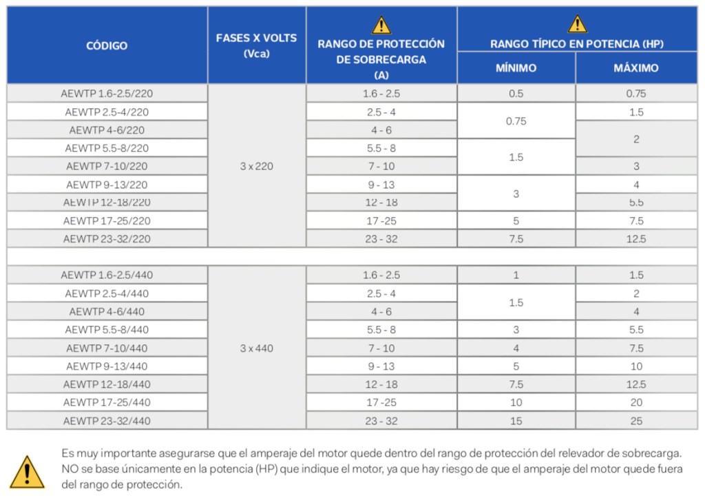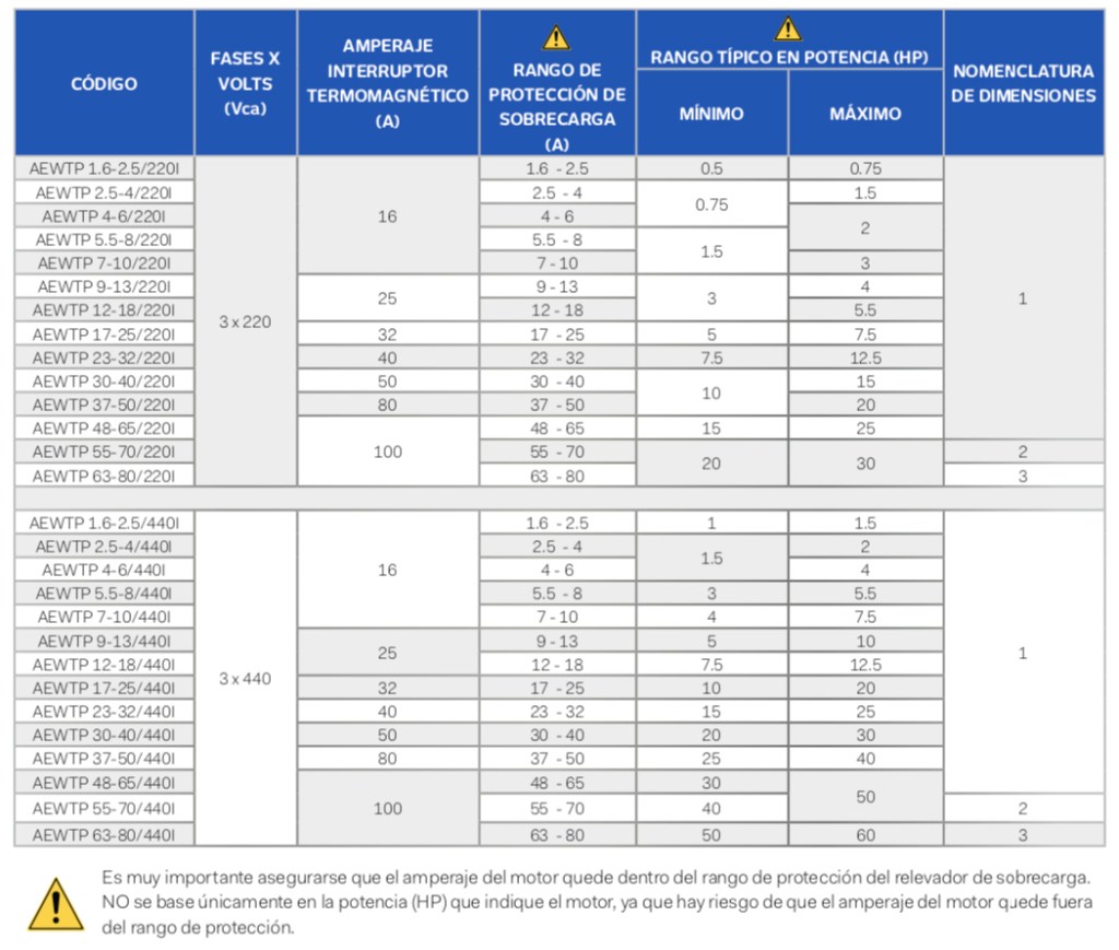 - Modelos trifásicos con rangos de protección desde 1.6A hasta 32A para aplicaciones en 220 Vca o 440 Vca.
