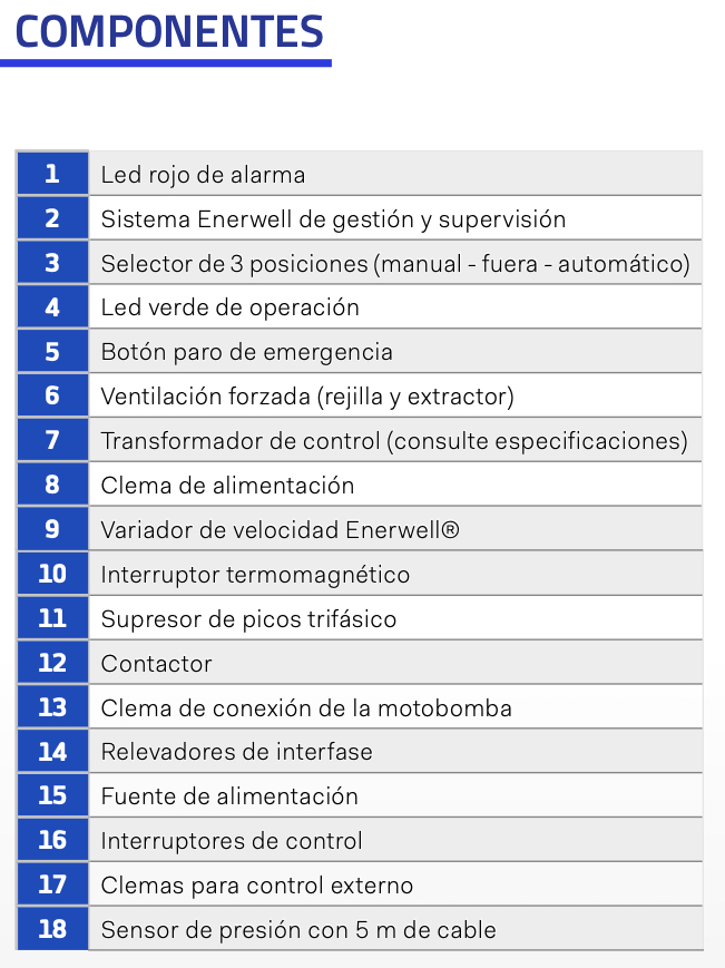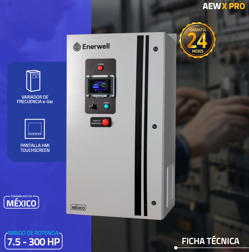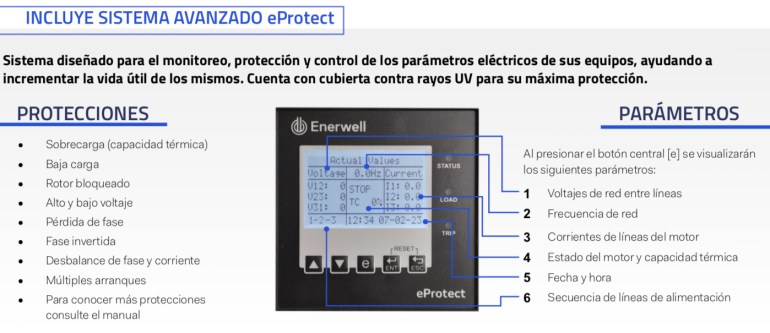 - Incluye interruptor termomagnético, contactor y relevador de sobrecarga Enerwell®.