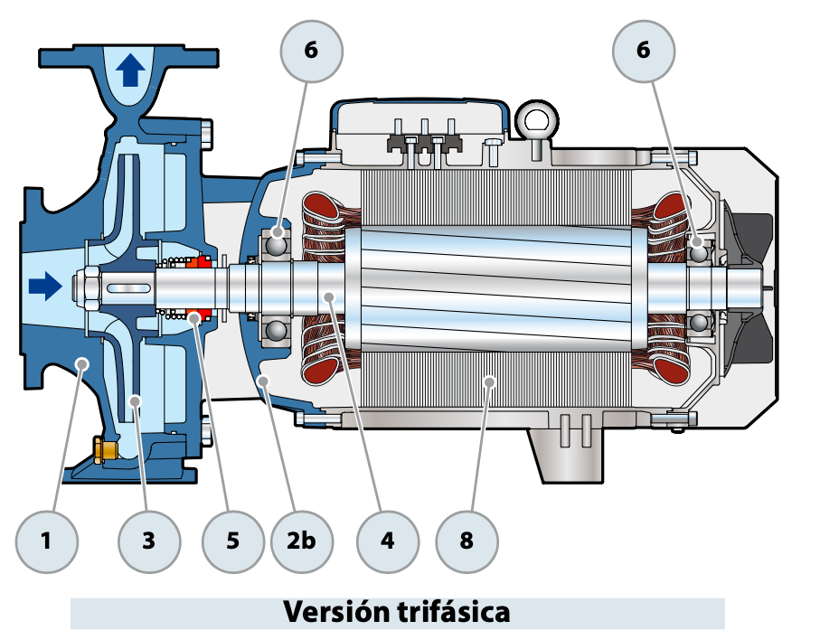 - Carcasa. 2. Plato adaptador. 3. Impulsor. 4. Sello Mecánico. 5. Flecha Eje Motriz 6. Motor Eléctrico.