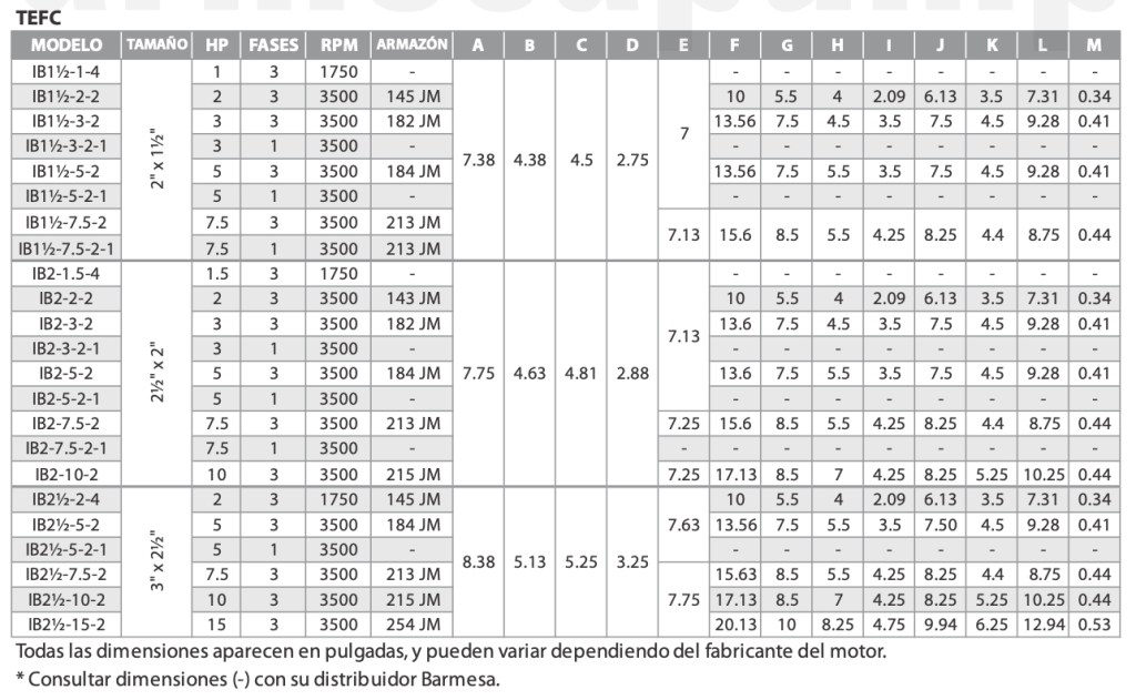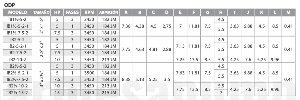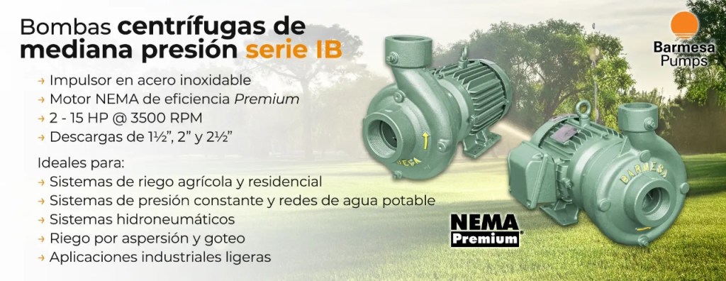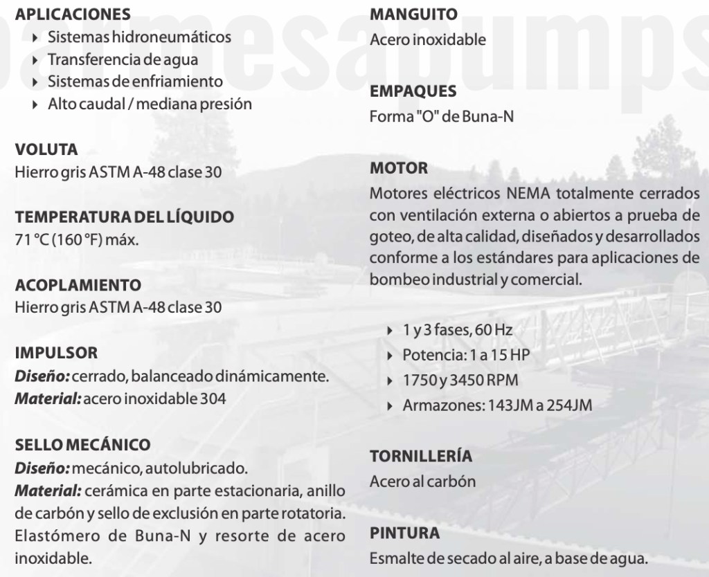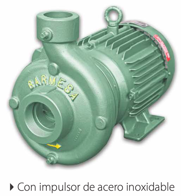Motobombas centrifugas de mediana presión con impulsor en acero inoxidable 304, cuerpo en hierro fundido, potencias de 1 hp hasta 15 hp, con revoluciones de trabajo de 1750 a 3500 rpm, tamaños de succión 2″ a 3″ roscadas npt, descargas de 1 1/2″ a 2 1/2″ roscadas npt, sello mecanico estandar en carbon-ceramica-buna e inoxidable, acoplado directamente motores electricos horizontales eficiencia premium, tccv y odp.