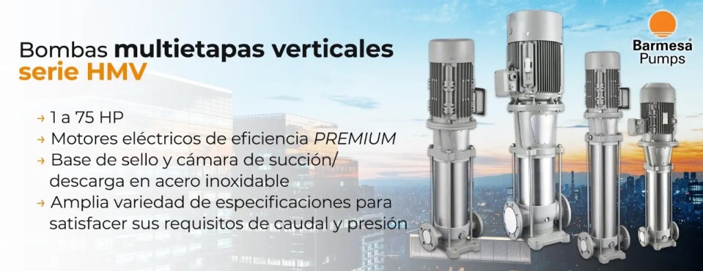 Nuestras bombas centrífugas multietapas verticales HMV son impulsadas por un motor eléctrico de eficiencia premium. La flecha del motor se conecta directamente con la flecha de la bomba a través de un acoplamiento. El cuerpo de bombeo y sus componentes son resistentes a la presión, y se encuentran sujetados al cabezal de succión/descarga y al acoplamiento del motor mediante pernos de anclaje de alta resistencia.